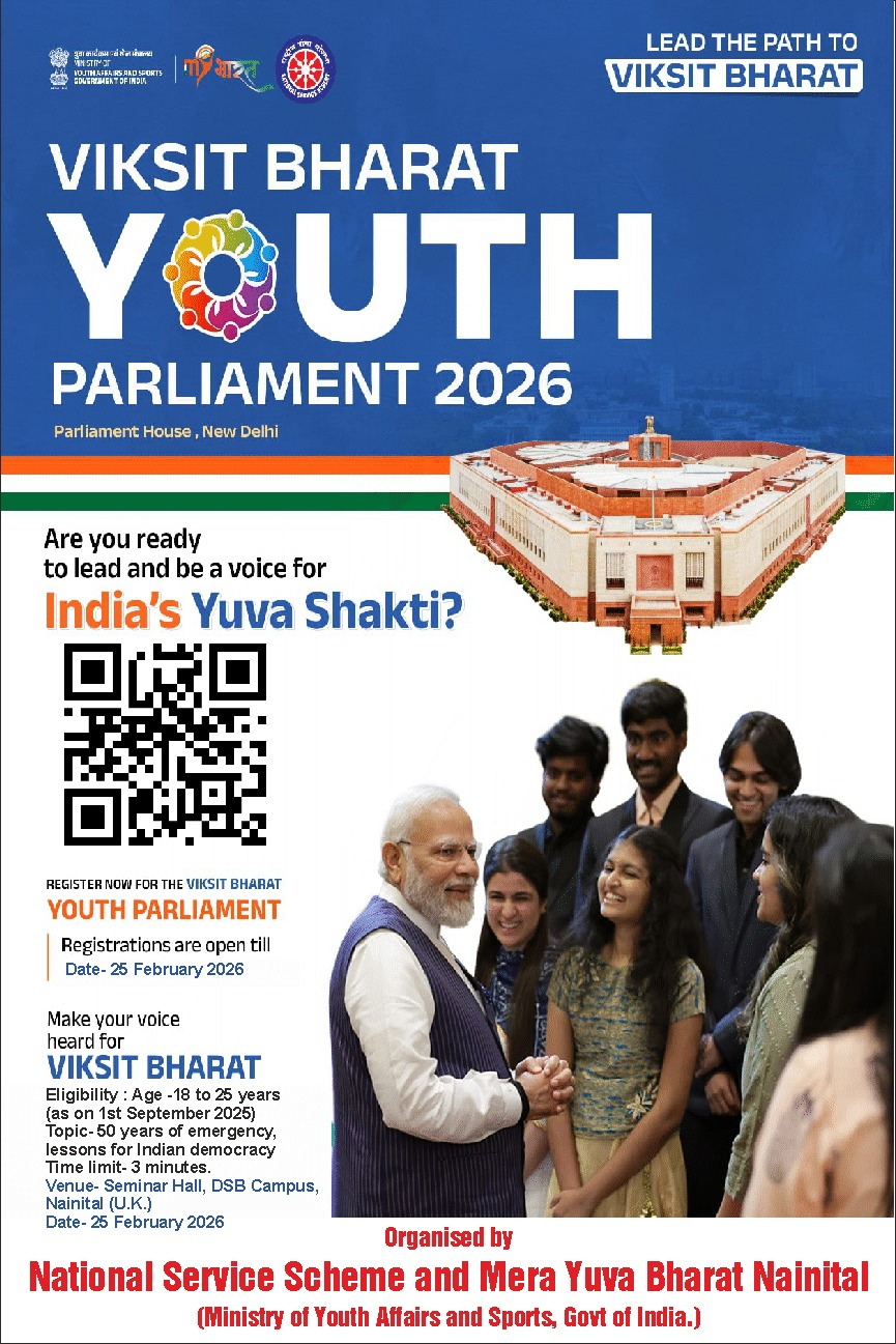 Nanital News : मेरा युवा भारत नैनीताल, युवा कार्यक्रम एवं खेल मंत्रालय, भारत सरकार तथा राष्ट्रीय सेवा योजना के समन्वय से विकसित भारत युवा संसद 2026 का आयोजन 25 फरवरी 2026 को प्रातः 11 बजे से सेमिनार हॉल, डीएसबी परिसर, नैनीताल में किया जा रहा है। इस संबंध में जानकारी देते हुए उप निदेशक मेरा युवा भारत नैनीताल डोल्वी तेवतिया ने अवगत कराया कि