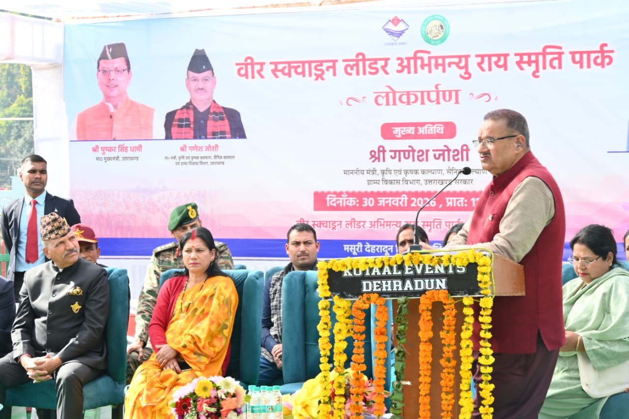 देहरादून, 30 जनवरी। सैनिक कल्याण मंत्री गणेश जोशी ने आज जैंतनवाला क्षेत्र में मसूरी-देहरादून विकास प्राधिकरण द्वारा मसूरी विधानसभा क्षेत्र के अंतर्गत ₹17.47 लाख की लागत से निर्मित वीर स्क्वाड्रन लीडर अभिमन्यु राय स्मृति पार्क के सौन्दर्यकरण कार्य का विधिवत लोकार्पण किया। इस दौरान सैनिक कल्याण मंत्री गणेश जोशी ने वीर स्क्वाड्रन लीडर अभिमन्यु राय नव निर्मित मूर्ति का भी अनावरण कर उन्हें पुष्प चक्र अर्पित कर श्रद्धांजलि दी। इस दौरान जैंतनवाला में ₹26.99 लाख की लागत के इण्टरलॉकिंग टाईल्स द्वारा सडक निर्माण कार्य का भी शिलान्यास किया।