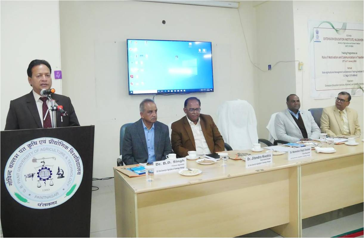 इस अवसर पर निदेशक, प्रसार शिक्षा, डा. जितेंद्र क्वात्रा ने प्रतिभागियों को संबोधित करते हुए विश्वविद्यालय की प्रमुख उपलब्धियों की जानकारी दी तथा विस्तार कर्मियों से अपील की कि वे केंद्र एवं राज्य सरकार की योजनाओं और कार्यक्रमों को जमीनी स्तर पर प्रभावी ढंग से लागू करें। कार्यक्रम के दौरान प्रशिक्षण समन्वयक, डा. बी.डी. सिंह, प्राध्यापक द्वारा समेटी-उत्तराखंड की प्रमुख उपलब्धियों का प्रस्तुतीकरण किया गया। वहीं प्रशिक्षण कार्यक्रम के पाठ्यक्रम निदेशक डा. एस.आर. वर्मा ने प्रशिक्षण की विस्तृत रूप-रेखा प्रस्तुत करते हुए प्रसार शिक्षा संस्थान, नीलोखेड़ी की गतिविधियों पर प्रकाष डाला। इस पांच दिवसीय प्रशिक्षण कार्यक्रम में उत्तराखंड राज्य के सभी जनपदों से आए कुल 35 मध्य स्तरीय विस्तार कार्मिक भाग ले रहे हैं। कार्यक्रम में विभिन्न विषय विशेषज्ञ, संसाधन व्यक्ति एवं संकाय सदस्य उपस्थित रहे। कार्यक्रम के अंत में ज्योति कनवाल, यंग प्रोफेशनल (द्वितीय), प्रसार शिक्षा निदेशालय द्वारा धन्यवाद ज्ञापन प्रस्तुत किया गया।